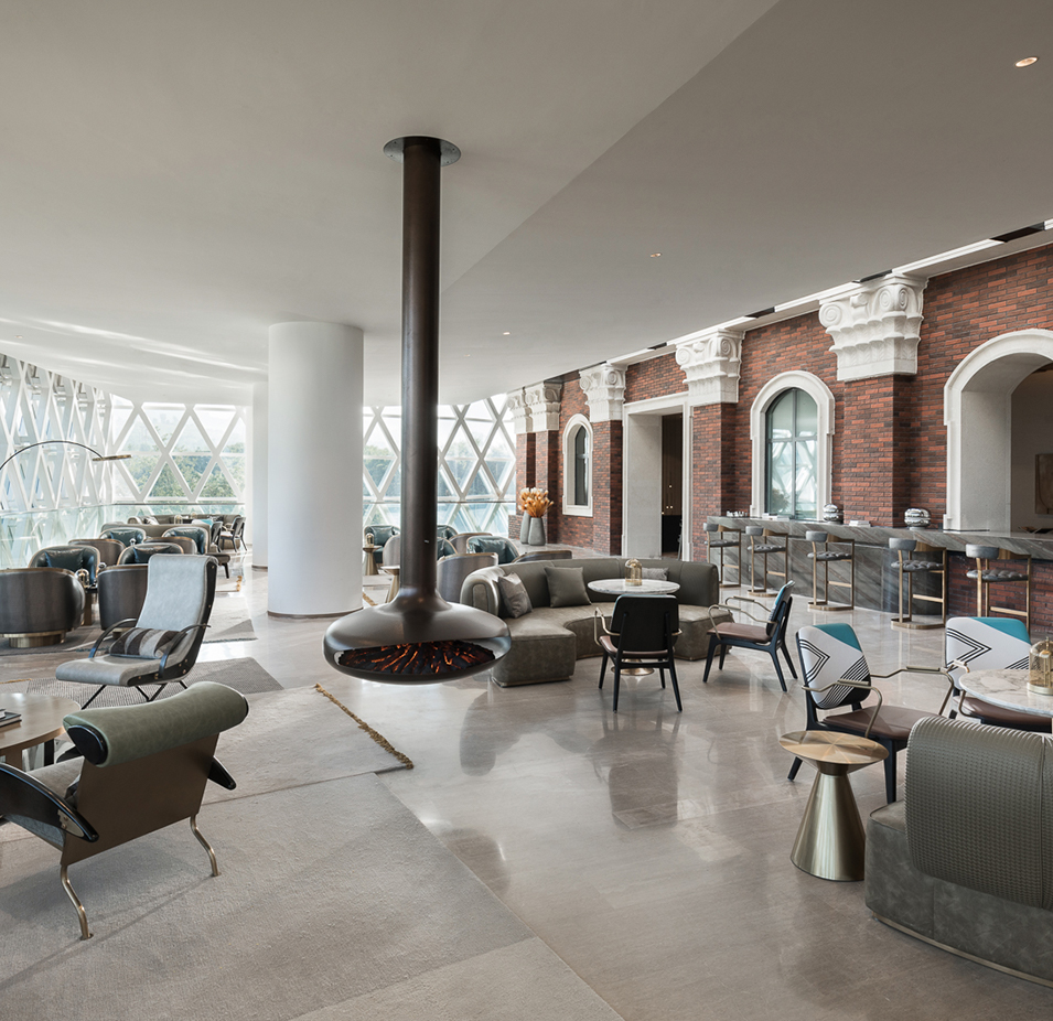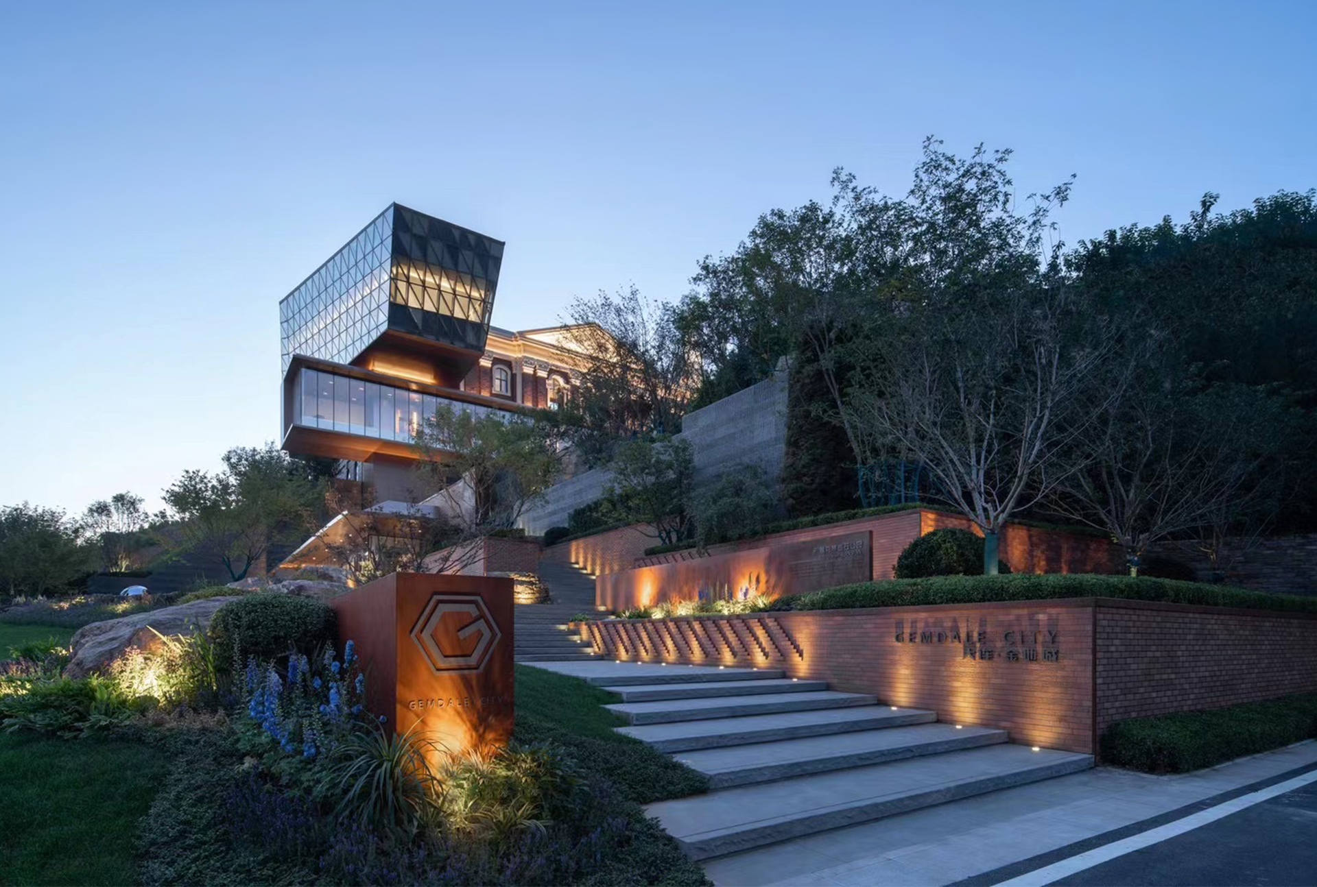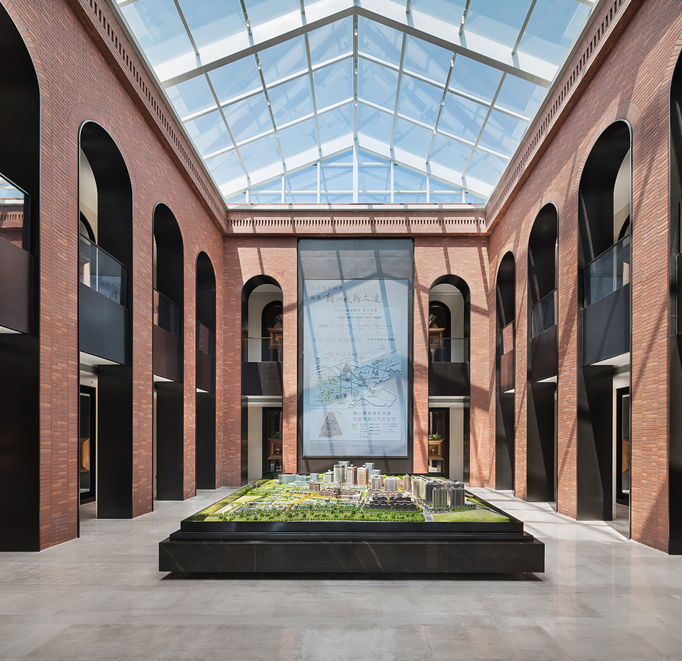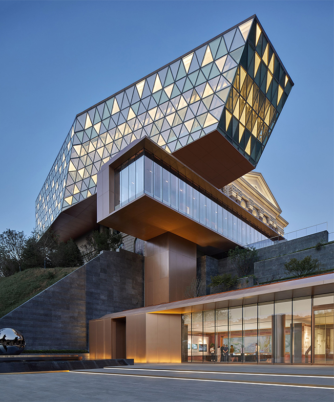 古典与现代冲撞融合的建筑形态,超尺度的悬挑契合山势,营造出兼顾形式美感与视线价值的姿态,室内古今融合互动,景观强调自然韵味,形成贯穿自然、古典、现代的穿越体验感。示范区呈现以来荣获美国GDF建筑景观双金奖等多项大奖,诠释了古典与现代、自然与匠造的艺术呈现。
