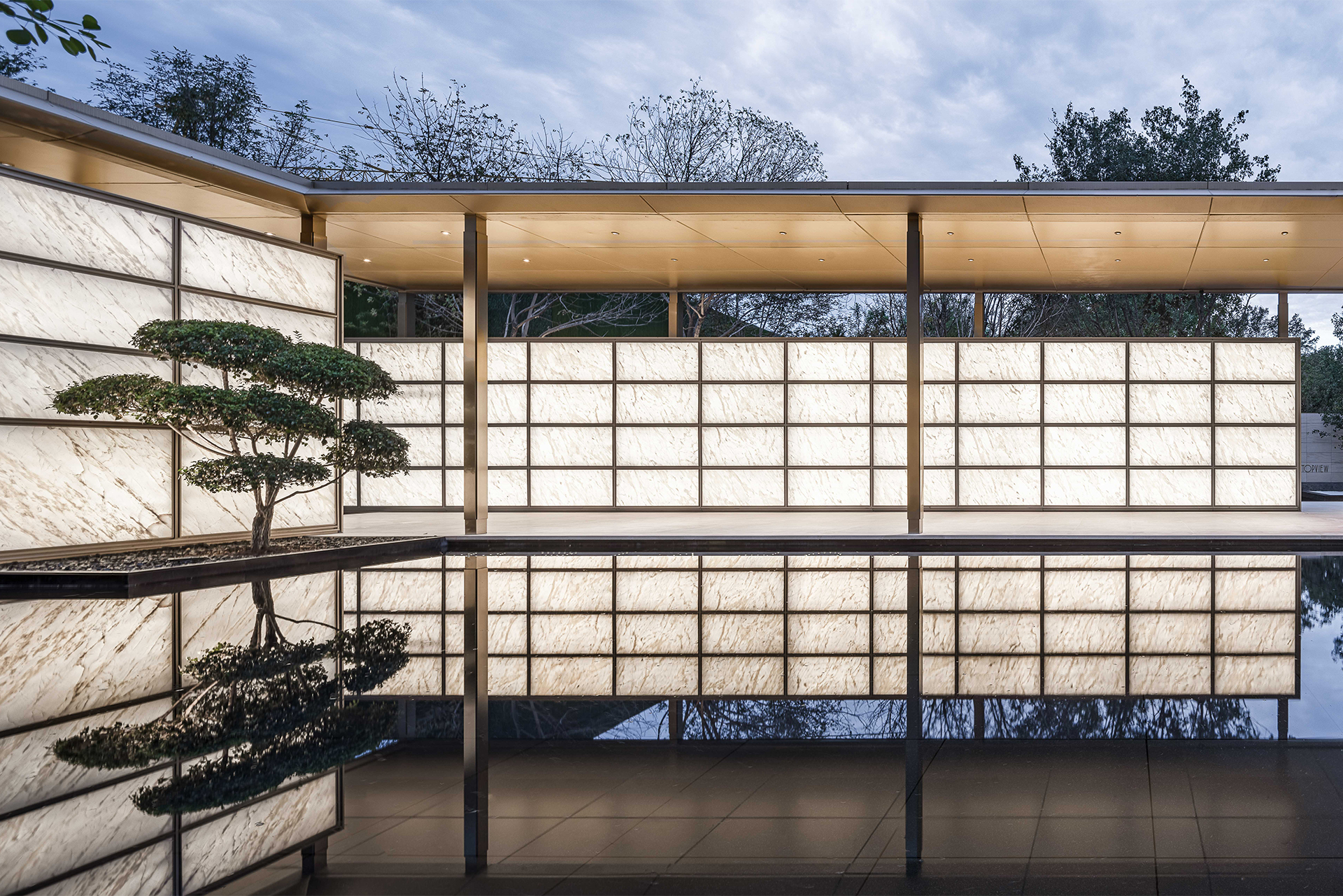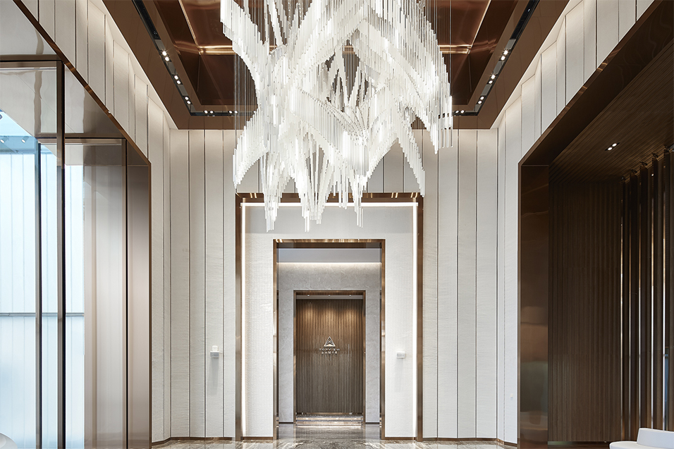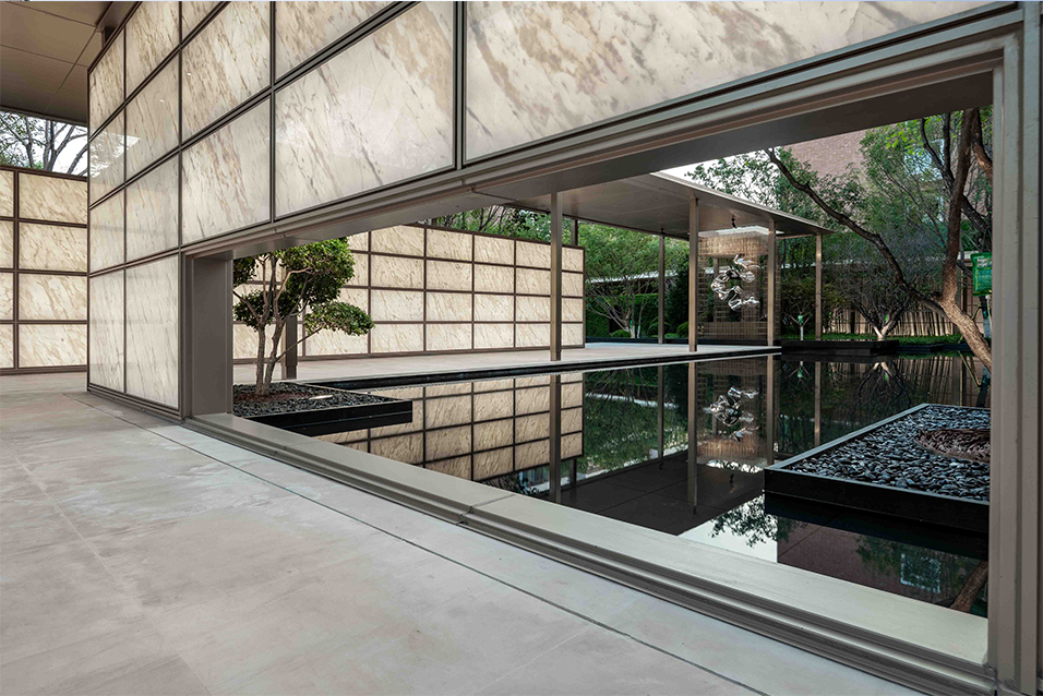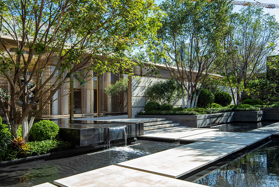 示范区建筑布局采用“围界造园”的手法,在临双峰道一侧,通过干净纯粹、深沉内敛的建筑语言,打造出具有美术馆气质的峯汇产品形象。在内部由建筑景观围合出纯美、古典的艺术庭院,唤起人们对这片独特土地的温暖回忆及对未来生活的美好憧憬。在空间流线设计上,营造了渐进式空间序列,由繁入简、潜光隐耀,蕴含着中国道家文化小隐于野、大隐于市的哲学思想。用微气候指导平面布局,兼顾艺术性与功能性。打造一座艺术、纯美,同时又体感舒适的示范庭园,形成纯净而有温度的产品气质。