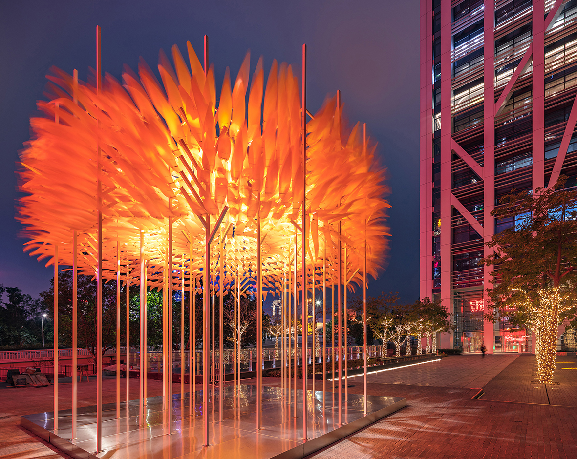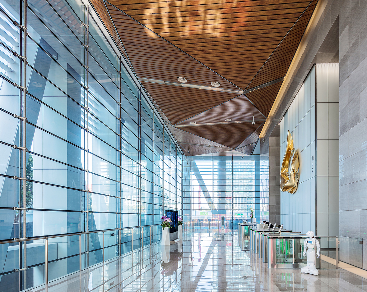 整座建筑的项目外立面设计,灵感取自于传统中国园林特有的格形窗,将斜条、直条、横条分解重塑,用枝型交错的造型表现出竹节的生长感,诠释了东方美学的窗的概念。
